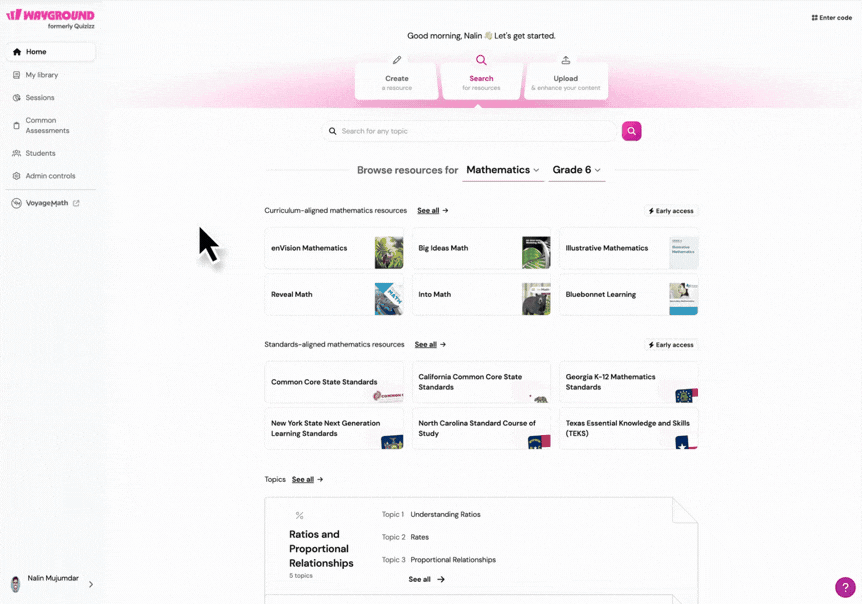 Educator (Teacher): Administers Common Assessments to their classes, views class-level performance data, and can access all teaching features on Wayground outside of Common Assessments.